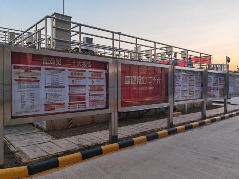 中環水務黨委堅持學習宣傳一體推進、相互促進。中環水務官網、官微、小程序、企業內刊四位一體、綜合發力。精心策劃二十大宣傳專題、專欄和專刊。下屬遂溪公司黨支部在城月總廠區張貼二十大精神系列海報,其他11個廠區通過拉橫幅、張貼二十大精神要點等形式將黨的二十大精神宣傳到基層。溫州中環黨支部制作專題宣傳欄,并通過LED電子顯示屏、QQ群、微信群、生產會議等載體,大力宣傳二十大精神,做到二十大金句人盡皆知,營造了濃厚的宣傳氛圍。蚌埠中環黨委利用機關大院3塊LED屏循環滾動宣傳二十大精神,并在大樓門廳處制作、展示黨的二十大報告解讀宣傳板報。