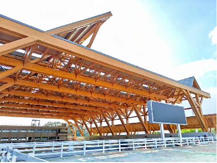 項目整體采用“鋼木結合”形式,兩側由鋼立柱作為支撐,屋架由鋼木桁架組成,屋面以金屬屋面板覆蓋,木結構材料選用層板膠合木-花旗松規格材,為新型特殊木質材料。