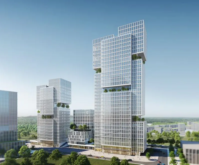 該項目位于深圳灣超級總部基地,總建筑面積15萬平方米,一期項目由6棟單元樓、裙房及三層地下室組成。其中,地上是集辦公、商業、通信機樓、文化設施于一體的城市綜合體,建筑高度146.9米;地下空間為商業、辦公配套、車庫及設備用房。