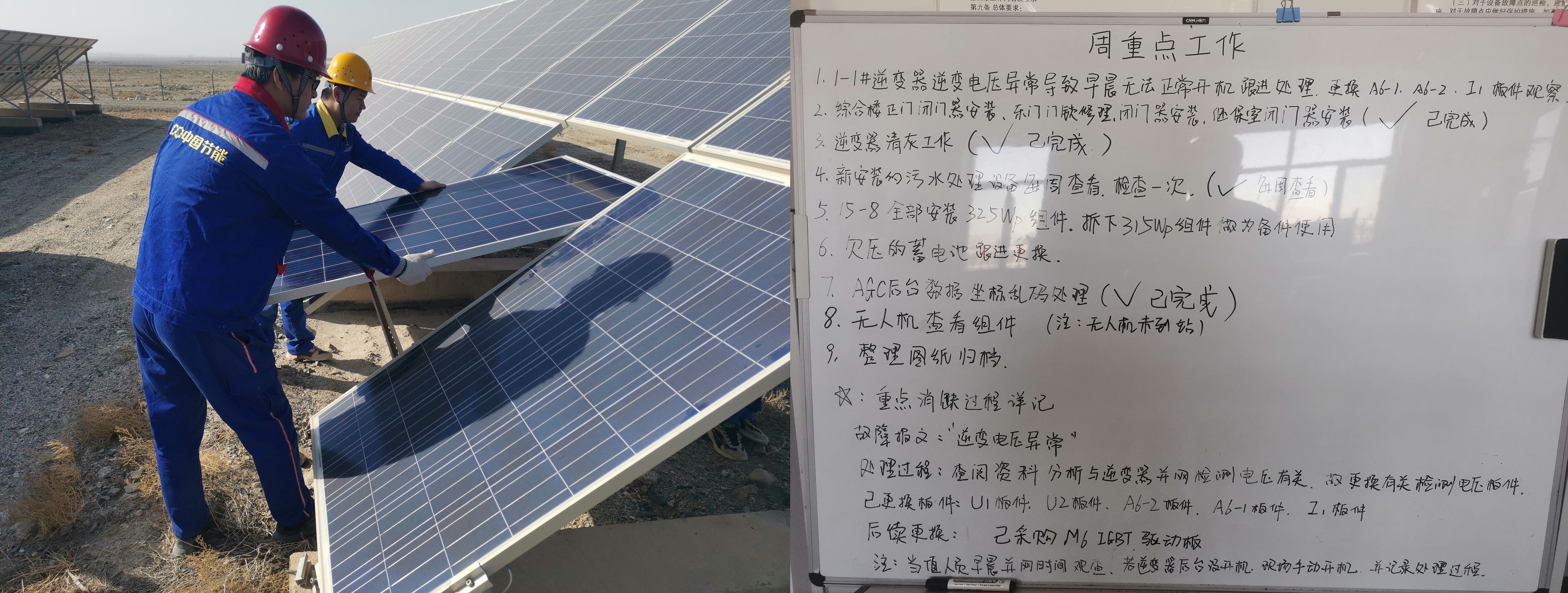 太陽能新疆區黨總支掀起“鏖戰四季度,大干70天”熱潮,各電站黨員干部認真商議,制定有效工作計劃,充分發揮員工主觀能動性,挖潛增效。 哈密公司運維團隊全力開展修舊利廢工作,對于長期高溫暴曬導致廠區組件焊點老化、虛焊脫焊等現象,班組長張波帶領班組成員開展了組件專項排故消缺工作,通過排查問題、檢測故障、更換低效能組件和破碎組件,自己動手焊接脫焊組件等一系列工作,組件問題得以解決,發電量顯著提升,每月可提升發電量約10萬度。 庫爾勒電站受疫情封閉影響,電站運維工作相對滯后,電站迅速成立黨團突擊隊,對發電設備、組件、高低壓開關柜、電力外送線路進行了一次專項巡檢維護,過程中共查找出37處設備故障問題隱患點。針對問題,突擊隊隊員隨即制定消缺方案,對故障問題進行及時消缺,保障了電站設備的最大出勤率,電站設備安全性進一步提高,發電量也有了大幅度提升。 11月初,為順利完成完成新疆電力公司二次網絡安防整改要求,庫爾勒公司黨團突擊隊協同廠家連續奮戰18小時,在規定時間內完成所有整改項目,有效避免了電站被拉停,減少了發電量損失,增加了經濟效益,為電站順利完成年度發電量指標奠定了堅實的基礎。 多措并舉顯成效 做好科技創新“領頭雁”