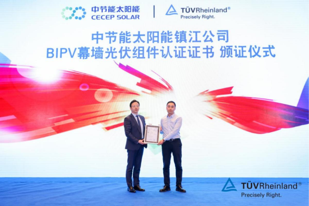近日,德國萊茵 TüV長三角太陽能測試中心落成典禮及光伏先進技術研討會隆重舉行。與此同時,TüV萊茵為中節能太陽能科技(鎮江)有限公司頒發了BIPV幕墻光伏組件認證證書。TüV萊茵全球電力電子產品服務副總裁兼大中華區太陽能與商業產品服務總經理李衛春先生及中節能太陽能鎮江公司副總經理高榮剛出席了頒證儀式。