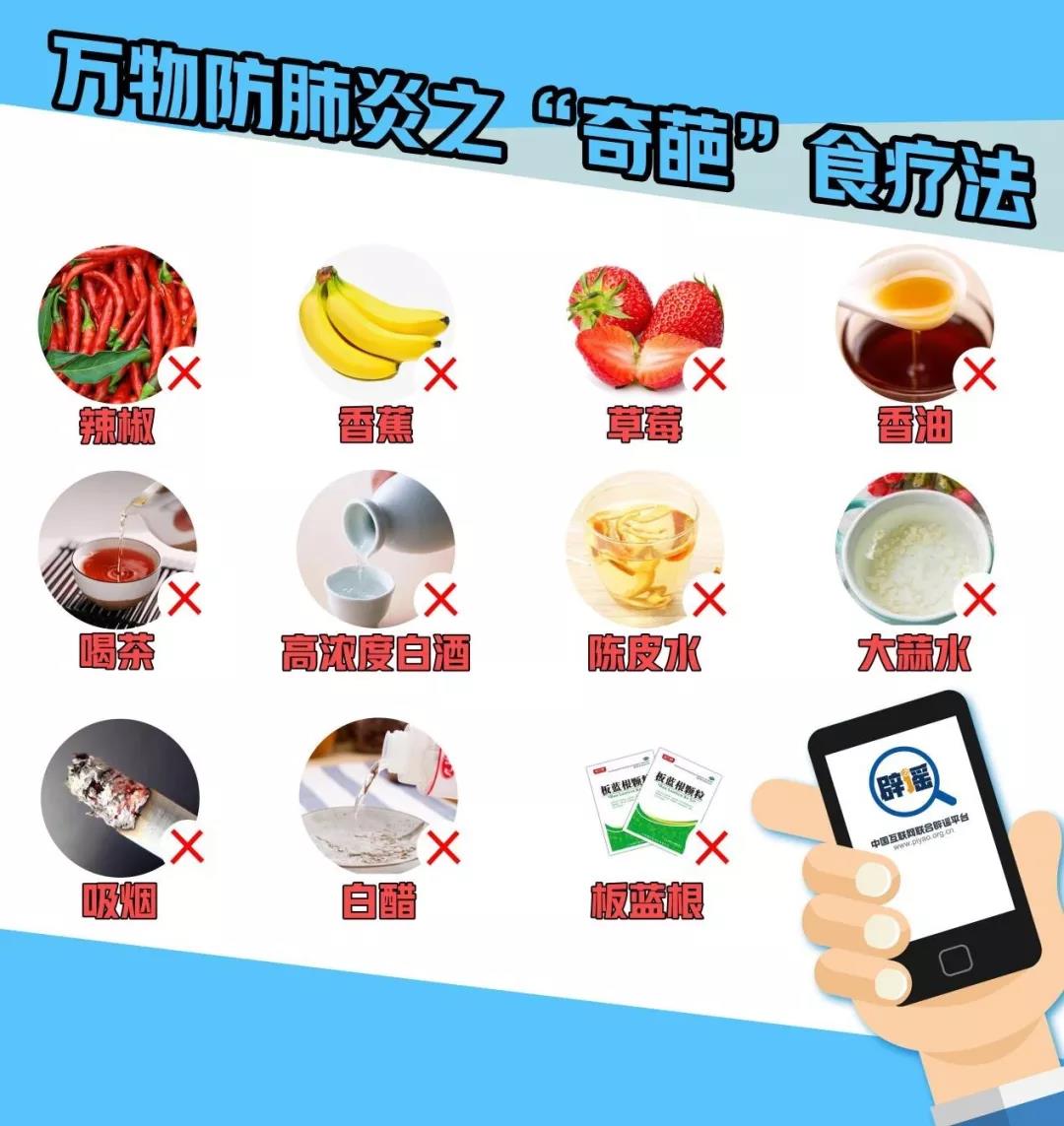 2020年的春節 一場新型冠狀病毒感染的肺炎 “來勢洶洶” 各類消息鋪天蓋地 一面是全民“戰疫”捷報頻傳 穩定人心 一面是偽科學、疫情謠言反復翻炒 乘虛而入 慧眼識謠,理性防疫 請看 《鑒謠手冊:“新型冠狀病毒感染的肺炎”謠言的六大套路》 套路一:“萬物治肺炎:吃XXX可防止冠狀病毒肺炎” 流傳版本:吃辣椒、香蕉、草莓、大蒜、喝茶、酒、陳皮水、大蒜水等。流傳中多借用“鐘南山建議”或是某位營養專家、權威媒體等名號。