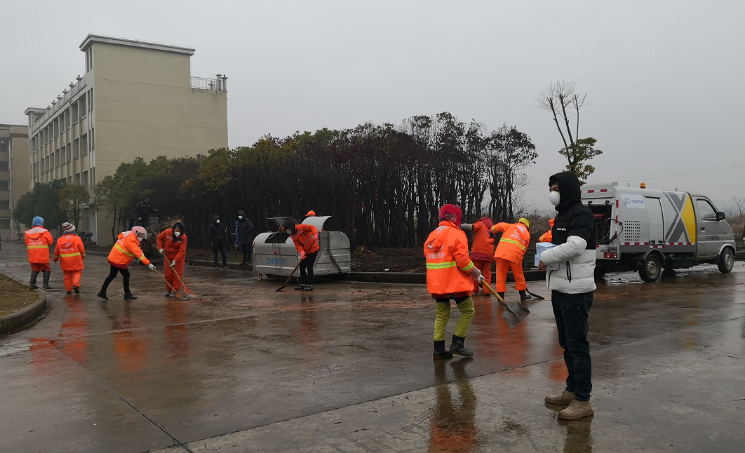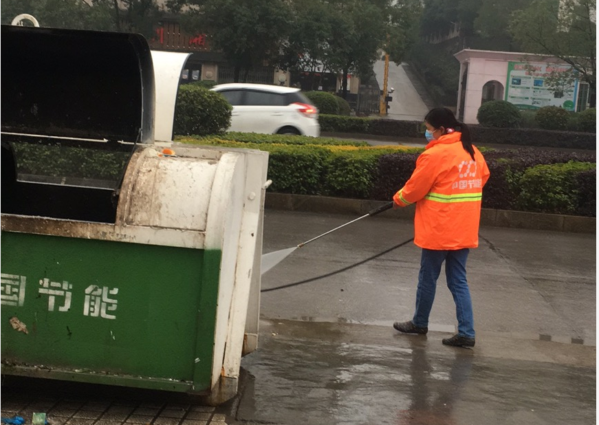 垃圾收集點沖洗作業 2019年11月1日,嘉魚公司全面接管嘉魚縣城區環衛工作,主要是城區道路清掃保潔、垃圾收集運輸轉運等工作。結合疫情發展,嘉魚公司及時加強防控措施:一是每日統計并上報員工身體情況,強調防護并加強宣傳督導;二是部署各醫院、隔離區的生活垃圾采用專箱、專車、專人清運,東門轉運站設立單獨站點,作業人員加強防護,加強消殺,杜絕感染風險;三是垃圾清運重心由路段轉向社區、小區,應對市民外出減少造成的垃圾分布轉移問題,避免積存;四是運輸車輛及公廁的日常消殺工作,提升防御等級;五是積極協調采購防護物資,做好后勤保障;六是配合政府工作,為嘉魚東交通管制點、隔離區辦公區域配置垃圾收集容器,調整收運路線,為工作人員生活提供便利。