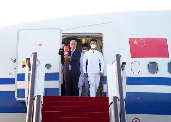 10月20日,在北京首都機(jī)場(chǎng),北京冬奧組委特別代表、北京冬奧組委副主席于再清(左)手持火種燈走出艙門。隨著北京冬奧組委赴希臘代表團(tuán)抵達(dá)首都機(jī)場(chǎng),北京冬奧會(huì)火種順利抵達(dá)北京。新華社記者 張晨霖 攝